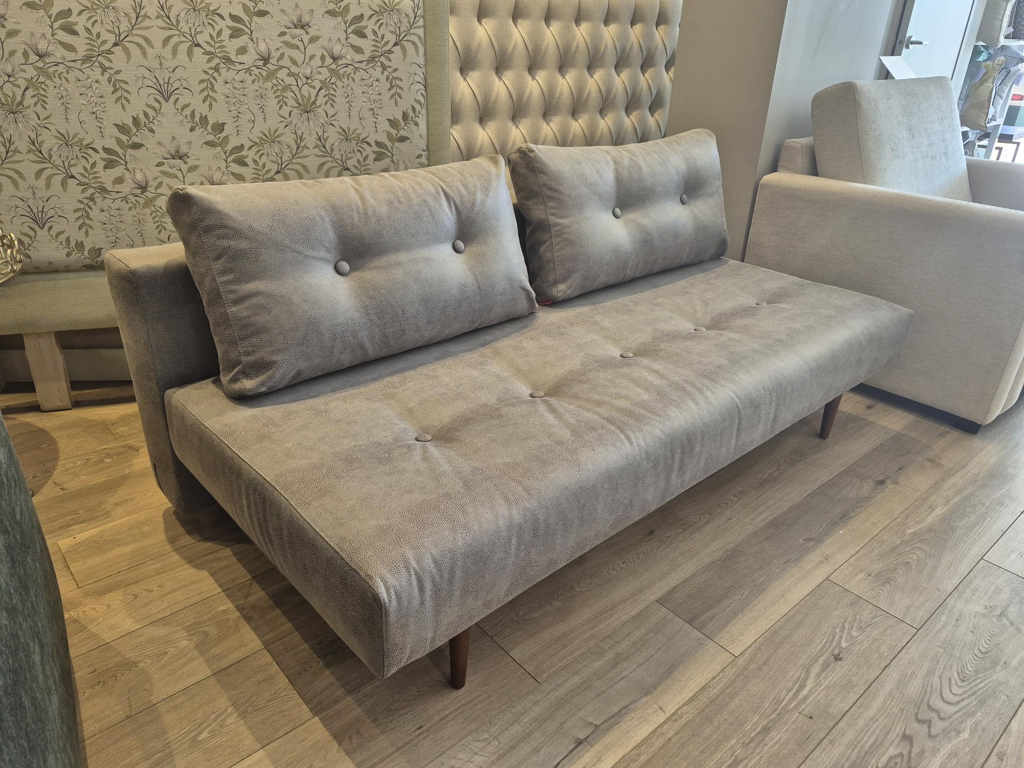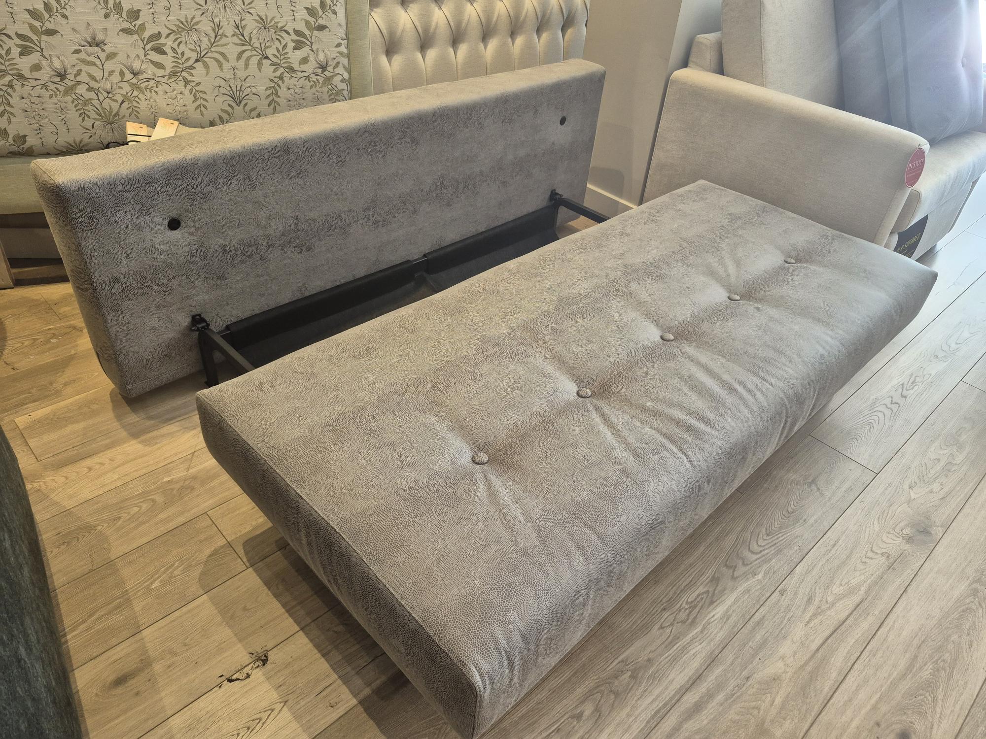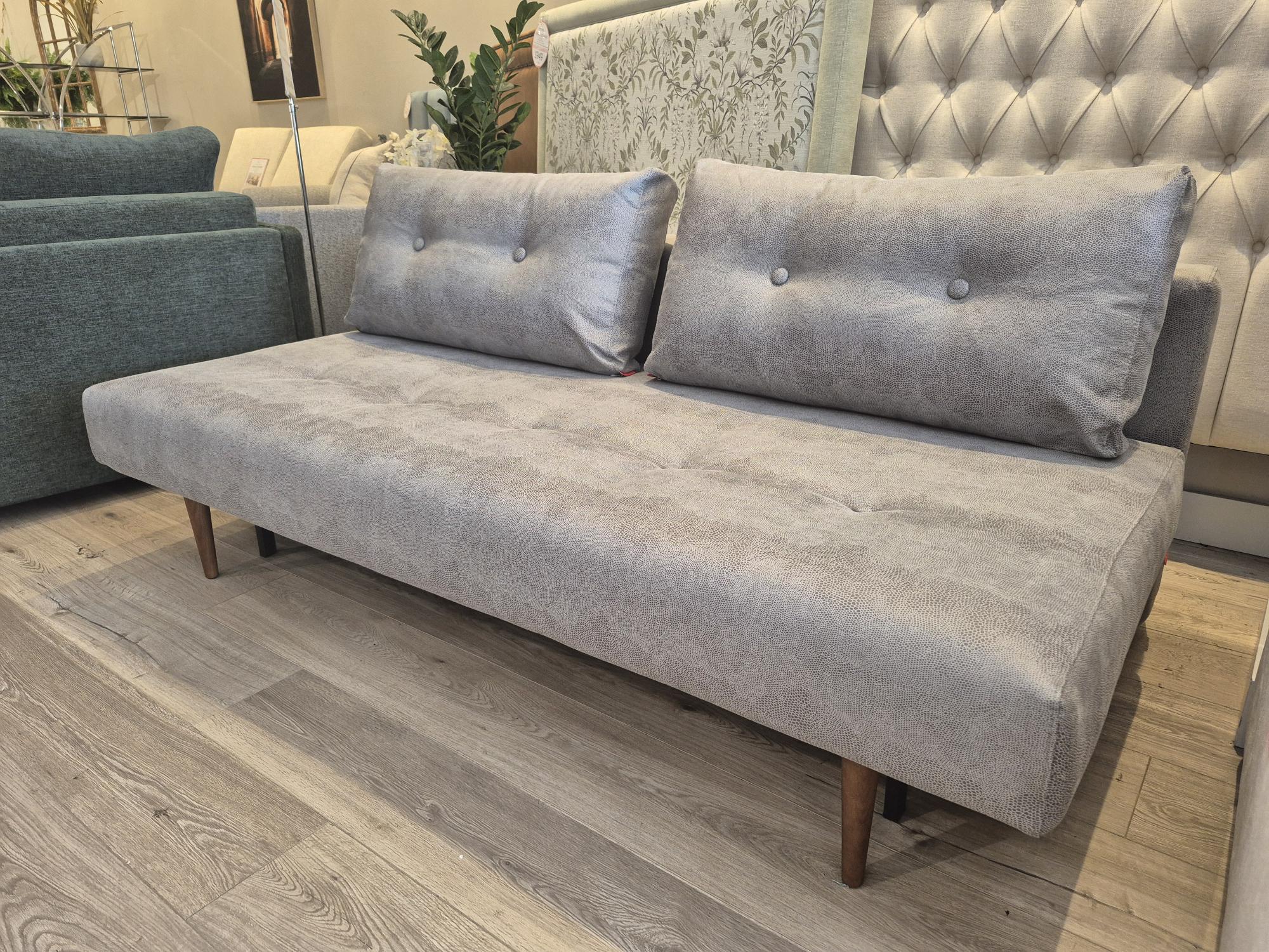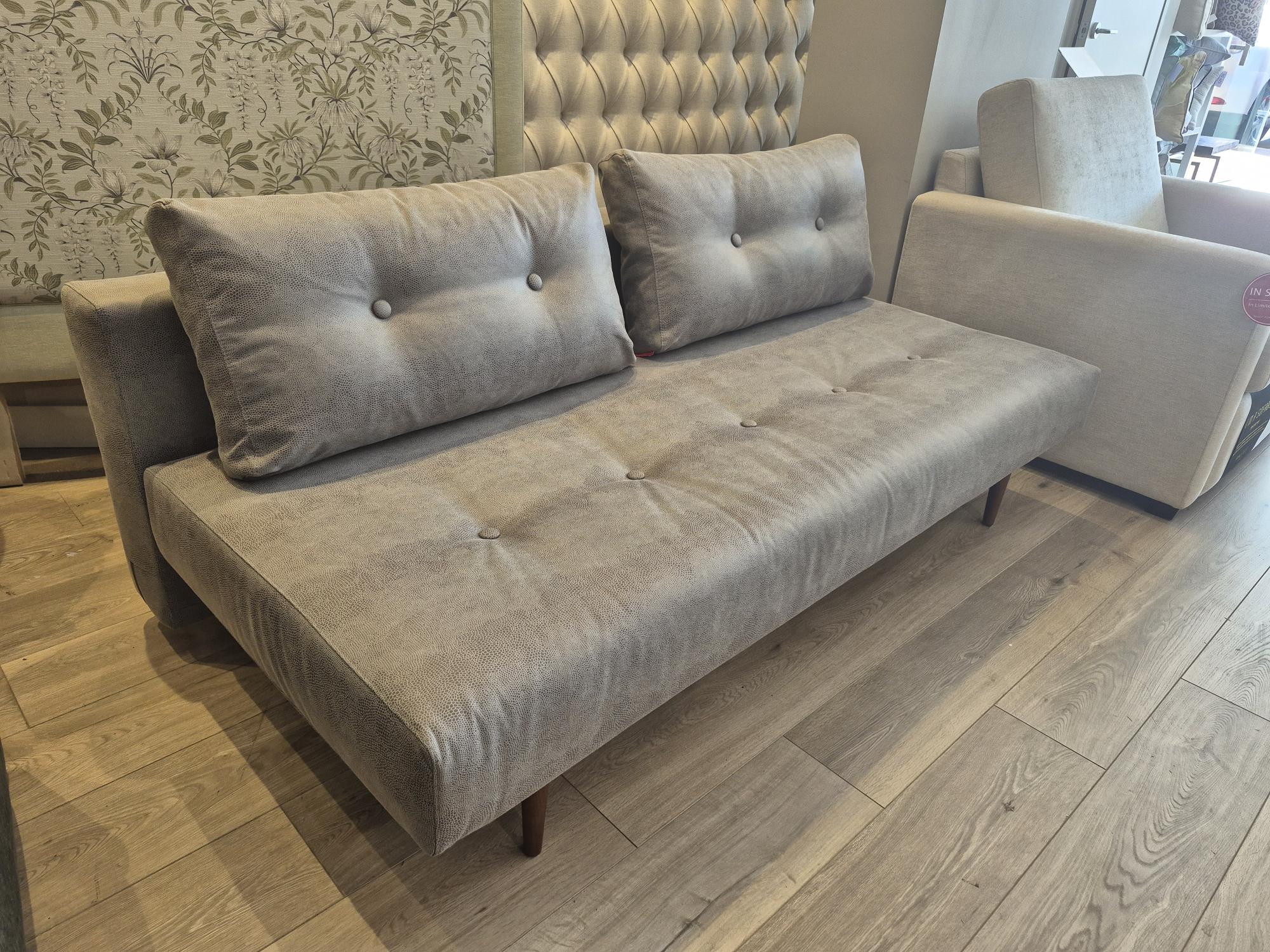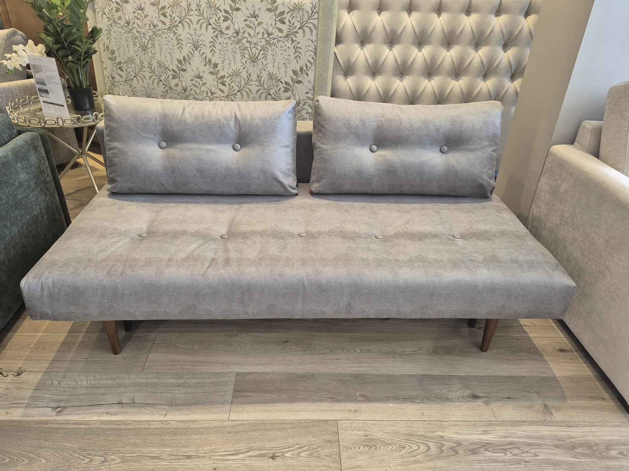 Our display Recast Compact Sofa bed from Innovatin Living is on clearance sale now! Its unique convertible design easily changes from a stylish sofa into a small double sofa bed 180cm long. Displayed in a Fabric with a Leather look. Available Now!