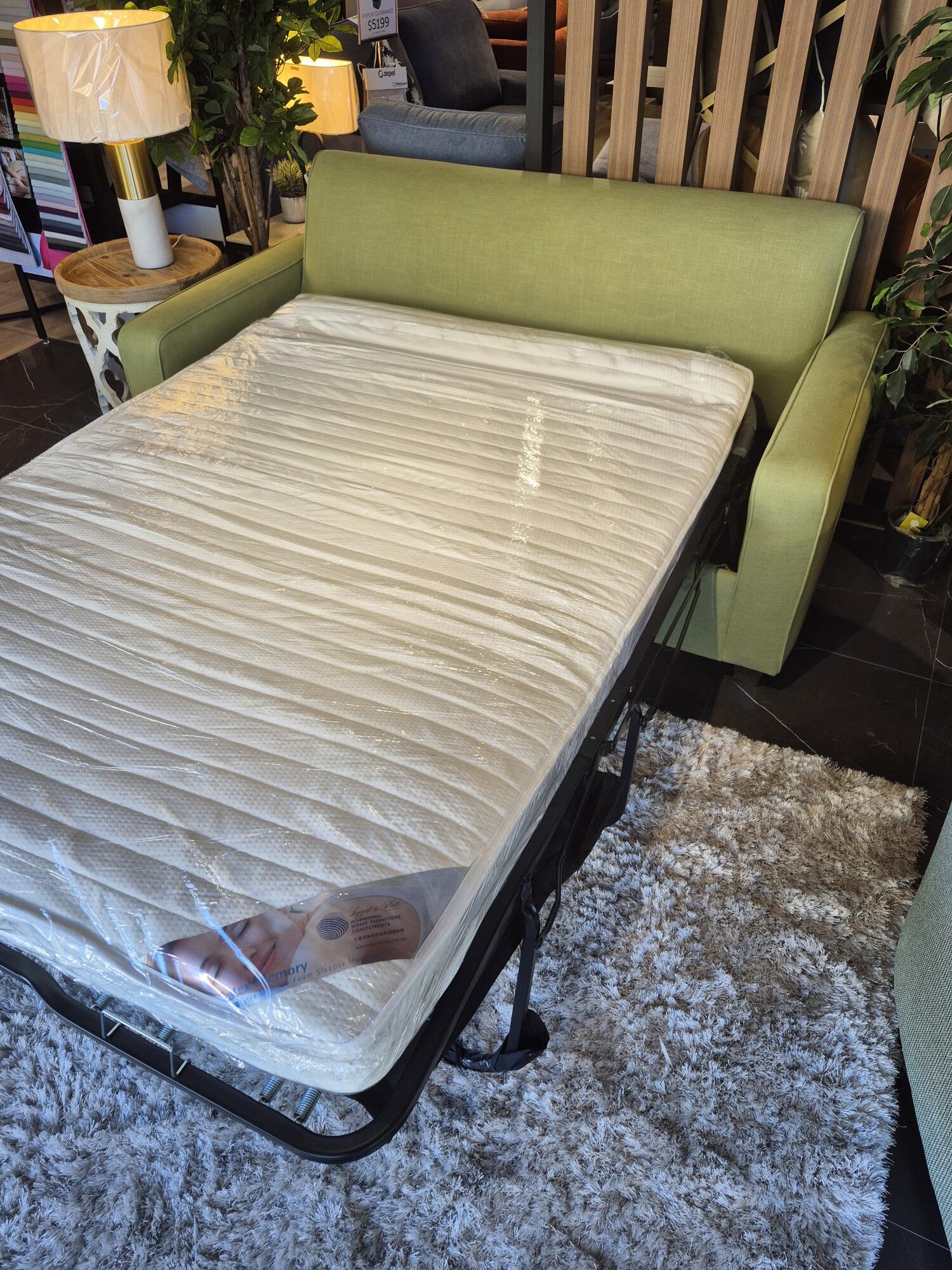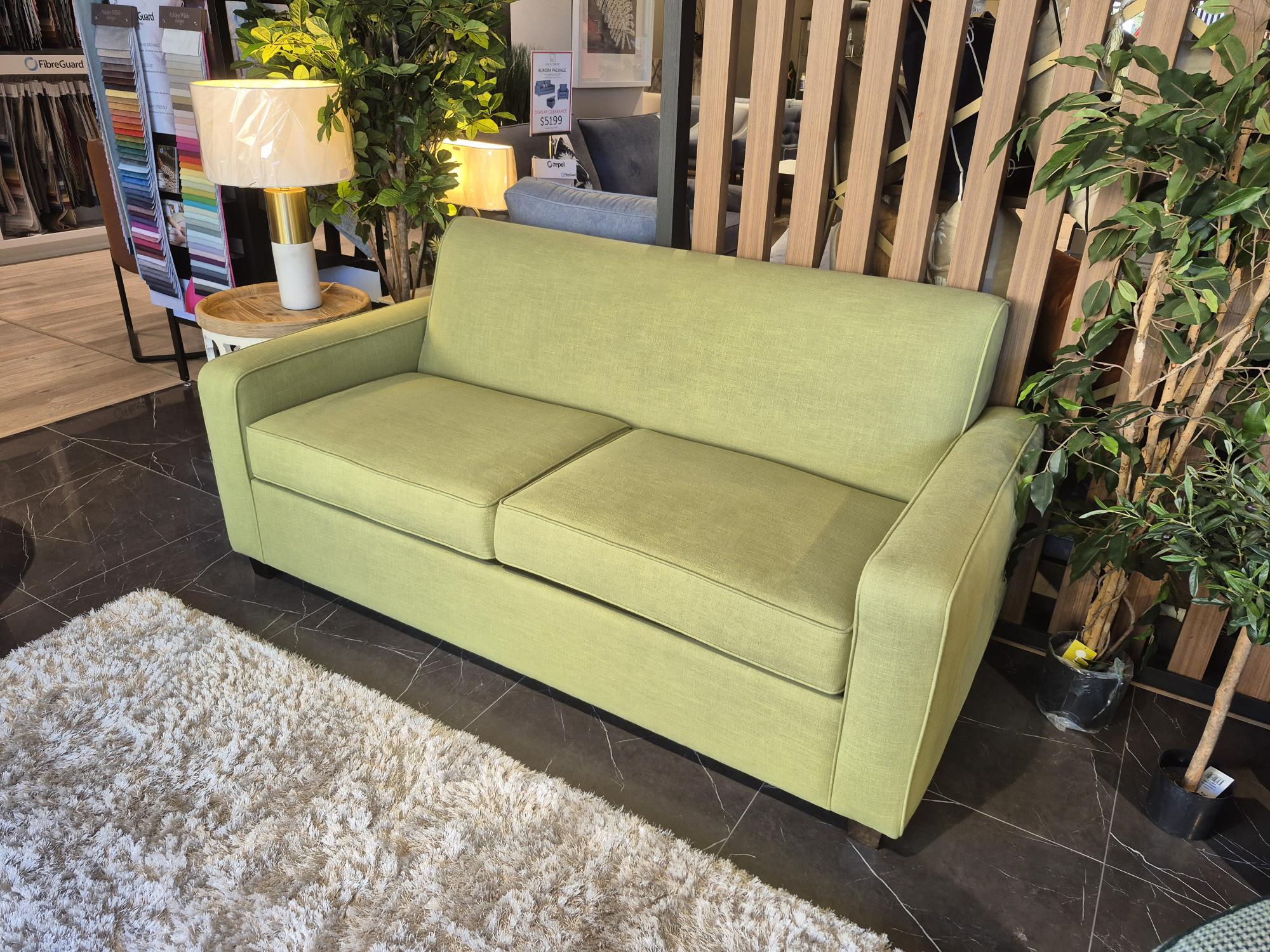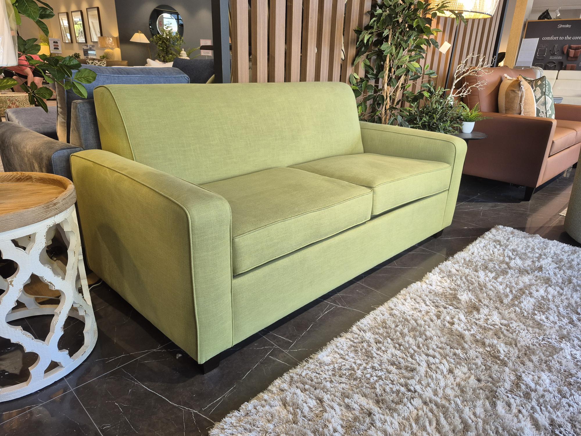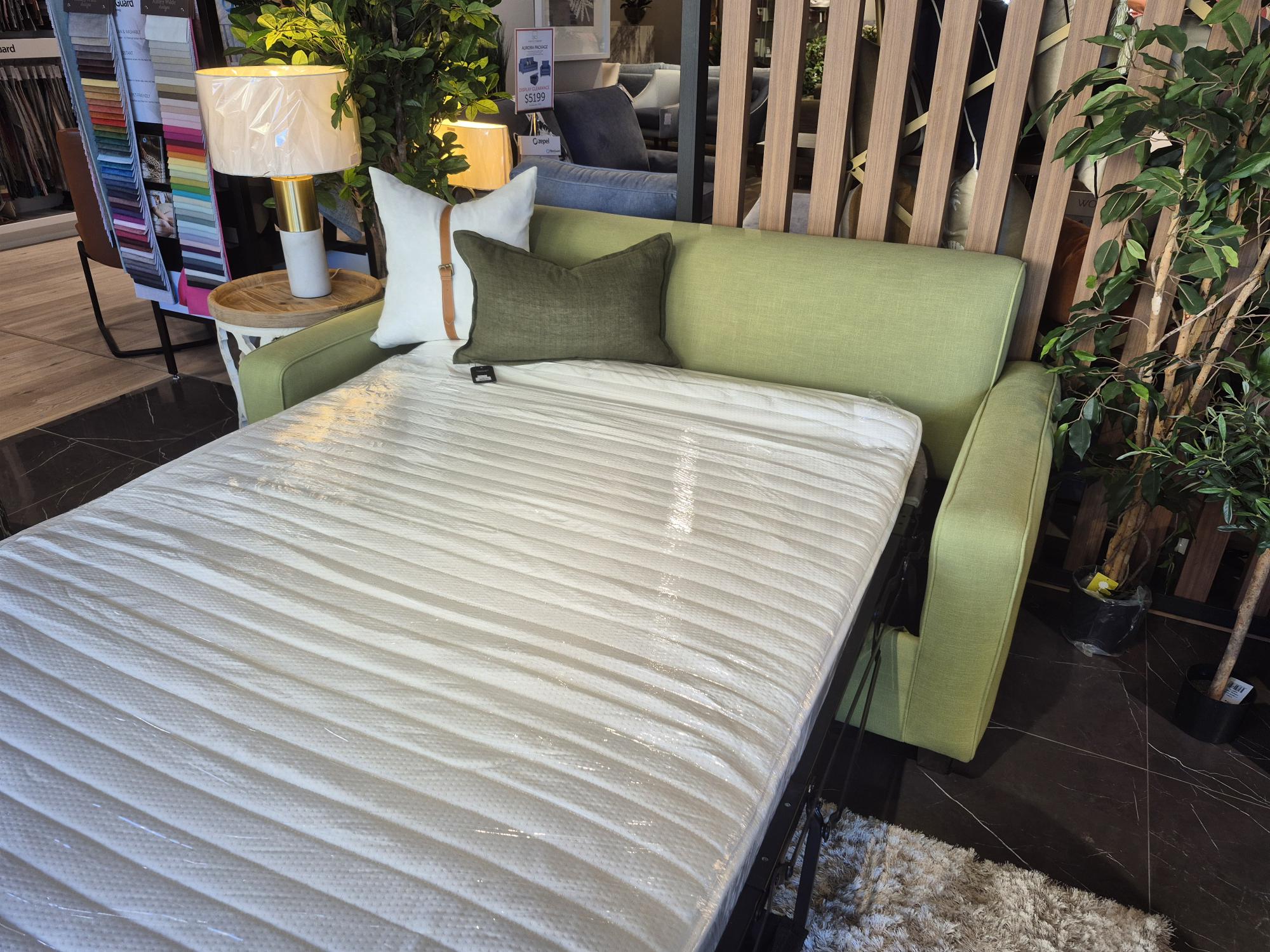 Our display Retro Sofa Bed model is on clearance sale now! Displayed in a stunning cotton polyester blend in green grass colour fabric with one of our most popular mattress options in the medium feel. Contact us now for this great deal.