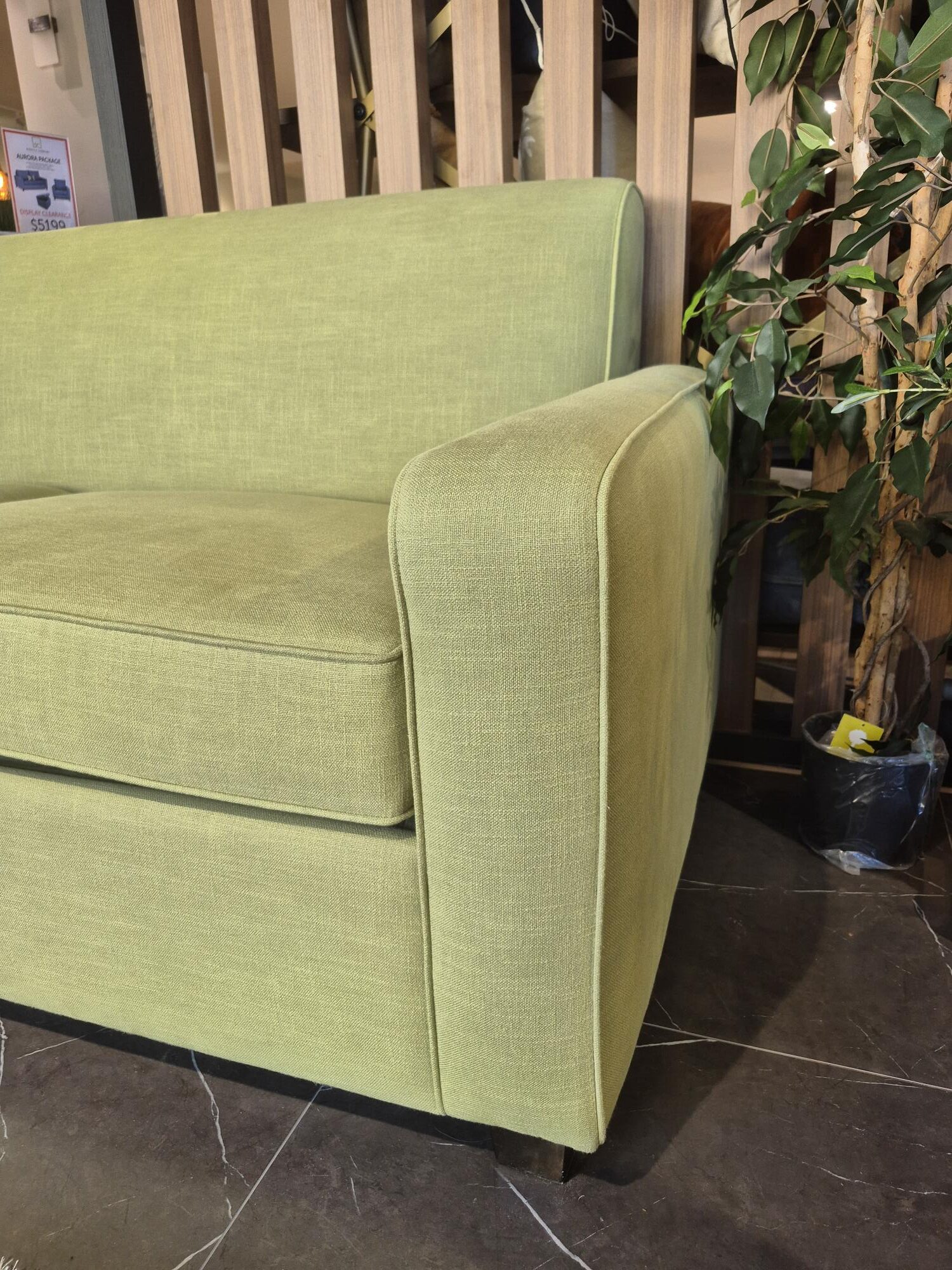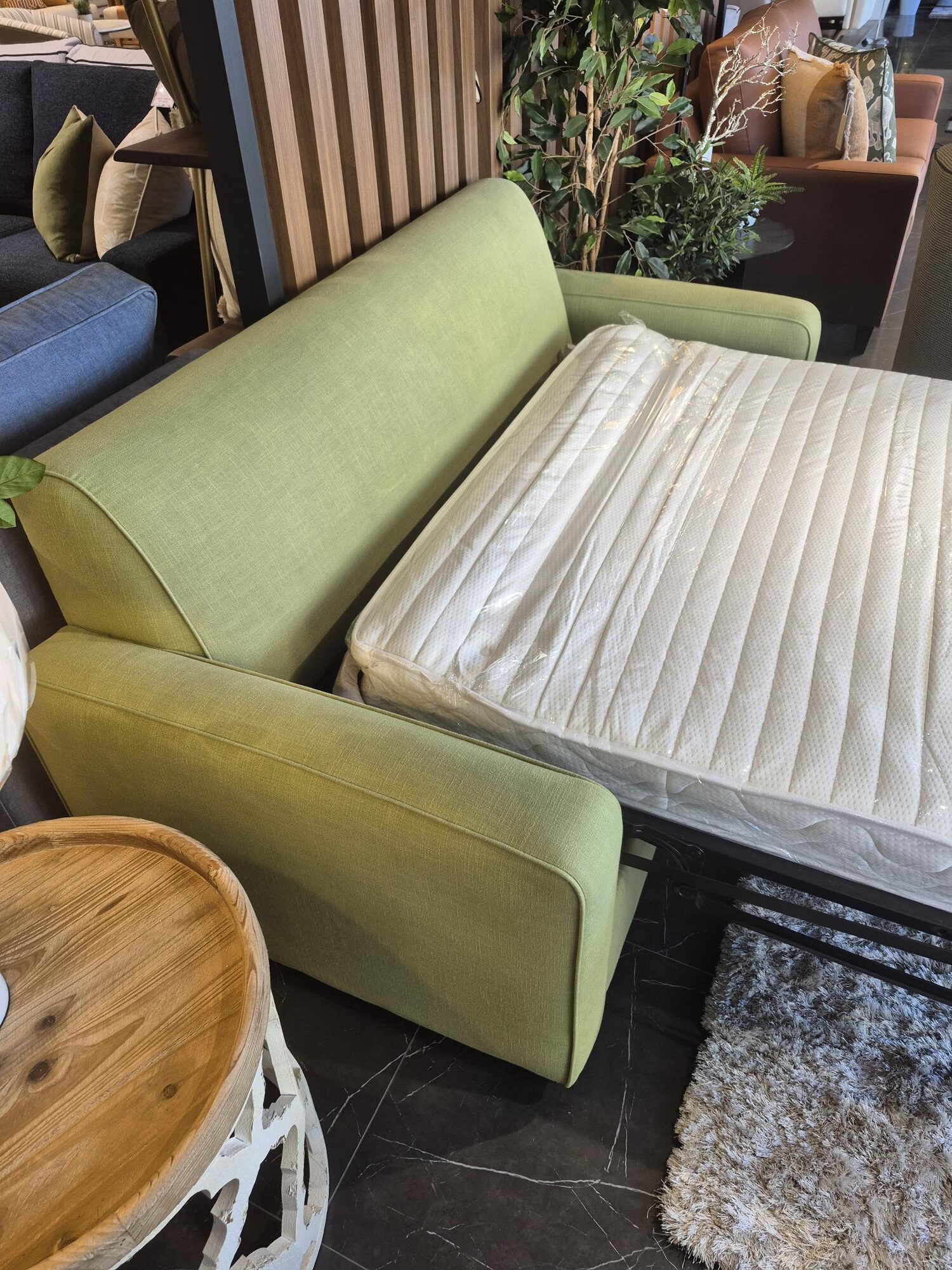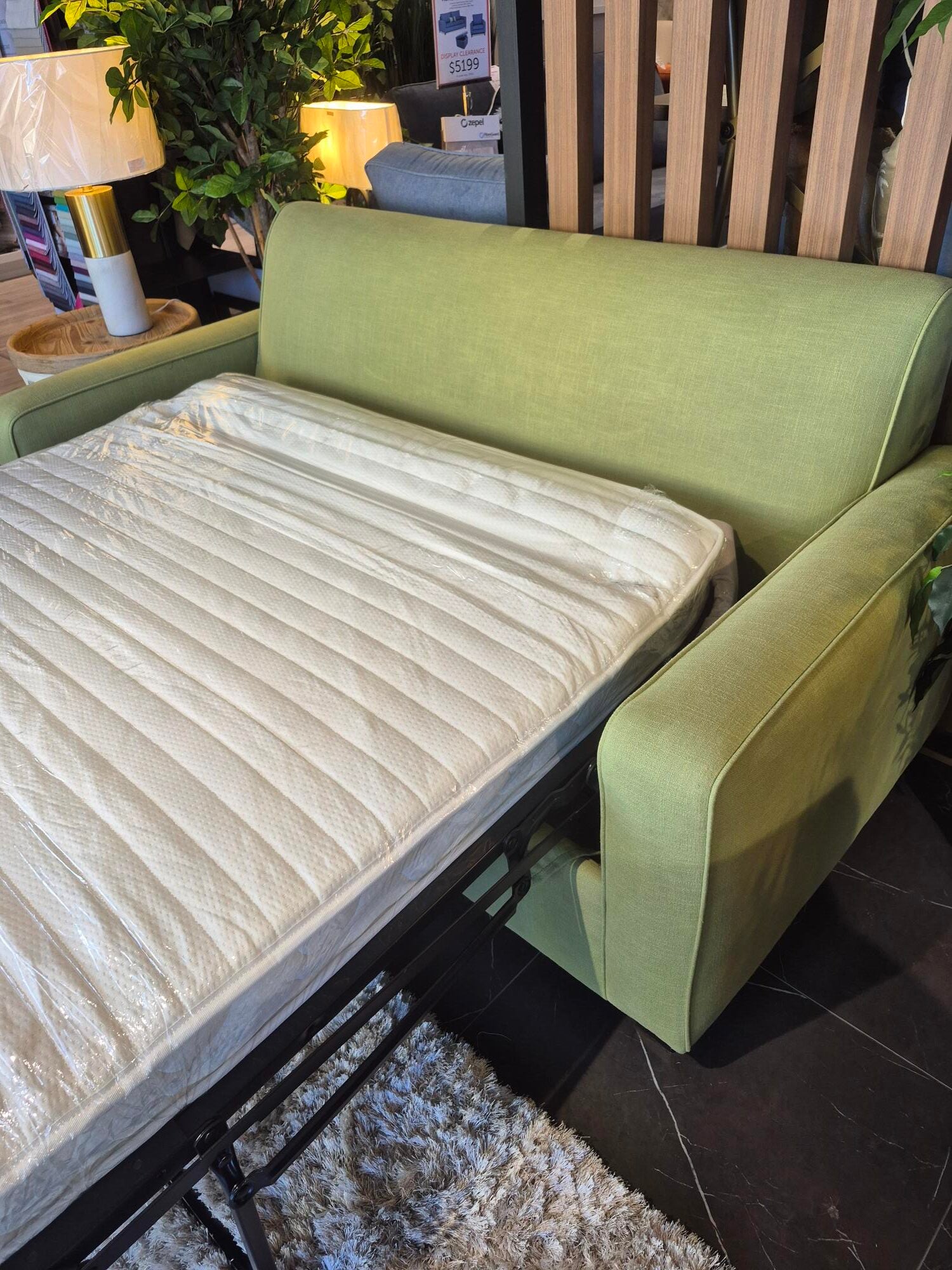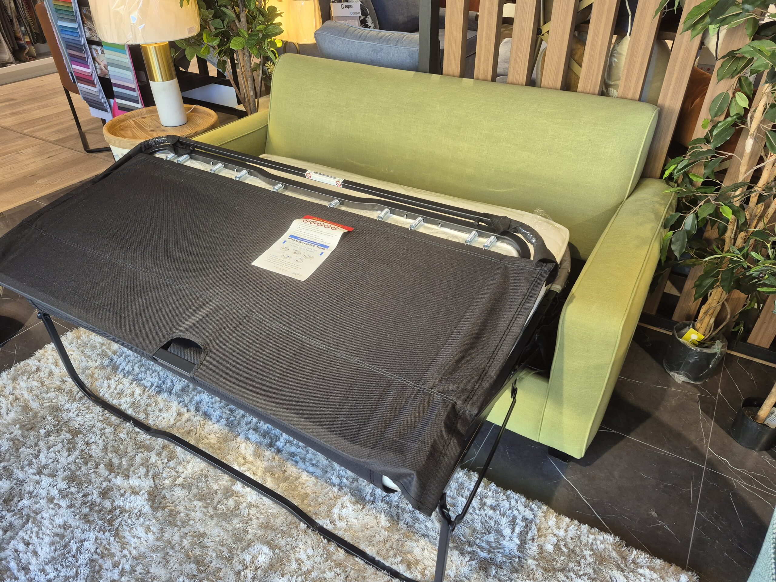 Our display Retro Sofa Bed model is on clearance sale now! Displayed in a stunning cotton polyester blend in green grass colour fabric with one of our most popular mattress options in the medium feel. Contact us now for this great deal.